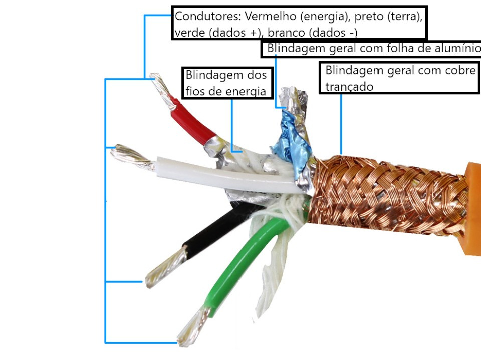 • Blindagem geral: envolve os 4 condutores do cabo USB com uma folha de alumínio (aluminum foil) e cobre trançado (braided shielding).
