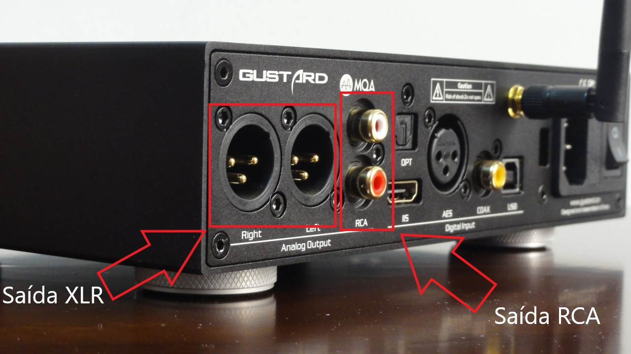 Saídas XLR e RCA na traseira do DAC Gustard X16 (Foto: Vitor Valeri/Hi-Fi Hub)