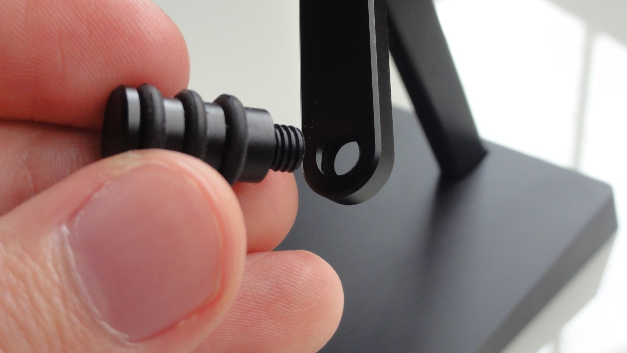 Note que a parte de cima do suporte tem uma distância menor que embaixo. Para alternar entre elas, eu desenrosquei o barril de apoio de um lado e tirei a peça de borracha do outro, invertendo a posição dos componentes.