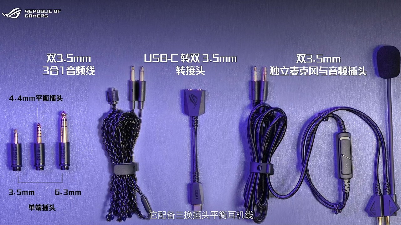 The audio-only cable (for music or in-game soundtracks) is modular and allows swapping between 3.5 mm, 6.35 mm, and 4.4 mm plugs. The cable with the built-in microphone includes in-line controls and two 3.5 mm plugs — one for audio and one for the microphone. If your laptop does not have a headphone output, a USB-C adapter with dual 3.5 mm jacks is included for use with the mic cable.