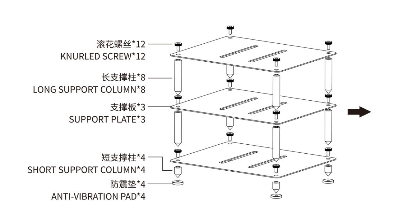 A montagem do rack da FiiO é simples e não necessita de ferramentas. Os andares são ligados por parafusos que tem a região central do topo abaulada para apoiar as colunas. Cada parafuso é rosqueado no topo das colunas e a chapa de metal fica no meio.