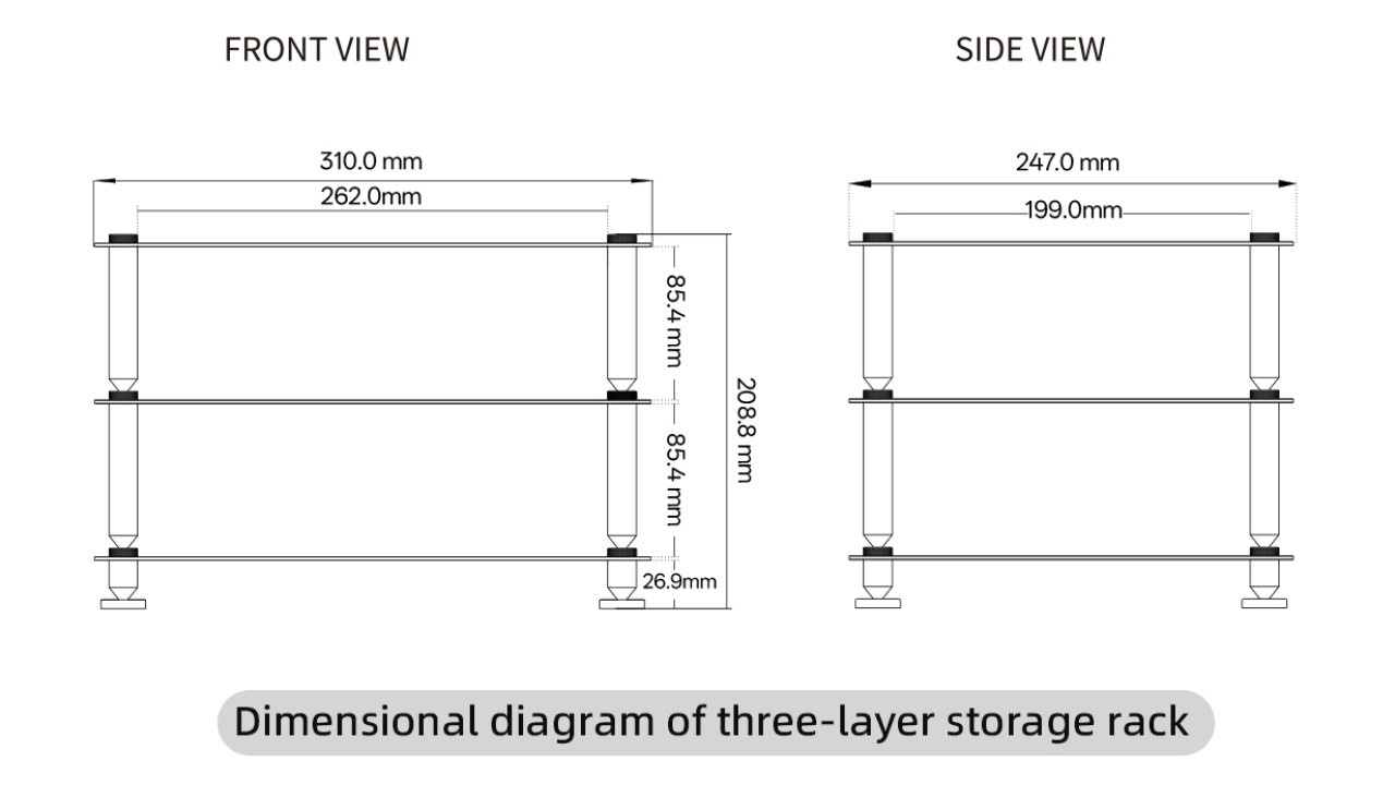 A distância entre o primeiro e o segundo andar, assim como do segundo andar e o terceiro, é de 8,5cm. Então se você tiver um dispositivo de mesa com uma altura maior, é recomendado apoiá-lo na chama de metal no topo na versão de 3 andares do rack.