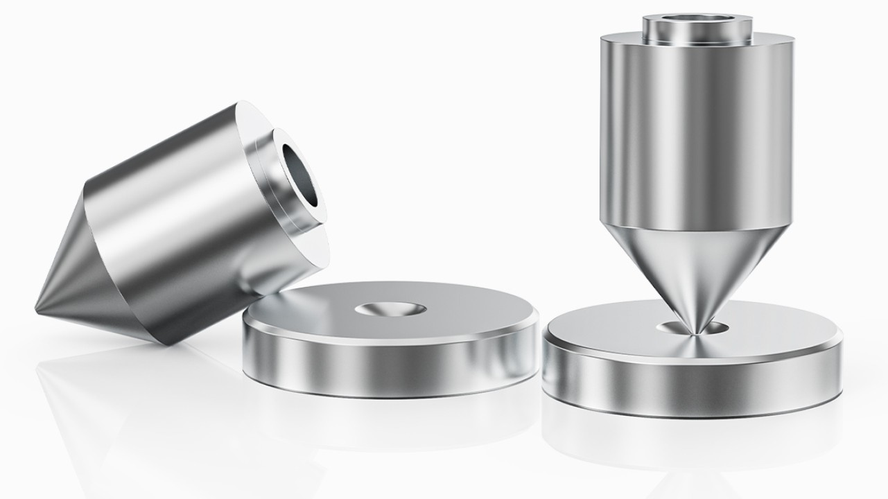 Para apoiar as chapas de metal, há colunas com um formato pontiagudo embaixo e parafusos com cabeça “plana” no topo. Utilizar pontas finas ajuda a aumentar a pressão em um pequeno ponto, que colabora para uma maior estabilidade. Note que para apoiar de forma que evite movimentos das peças, há uma área abaulada na região onde as colunas se apoiam.
