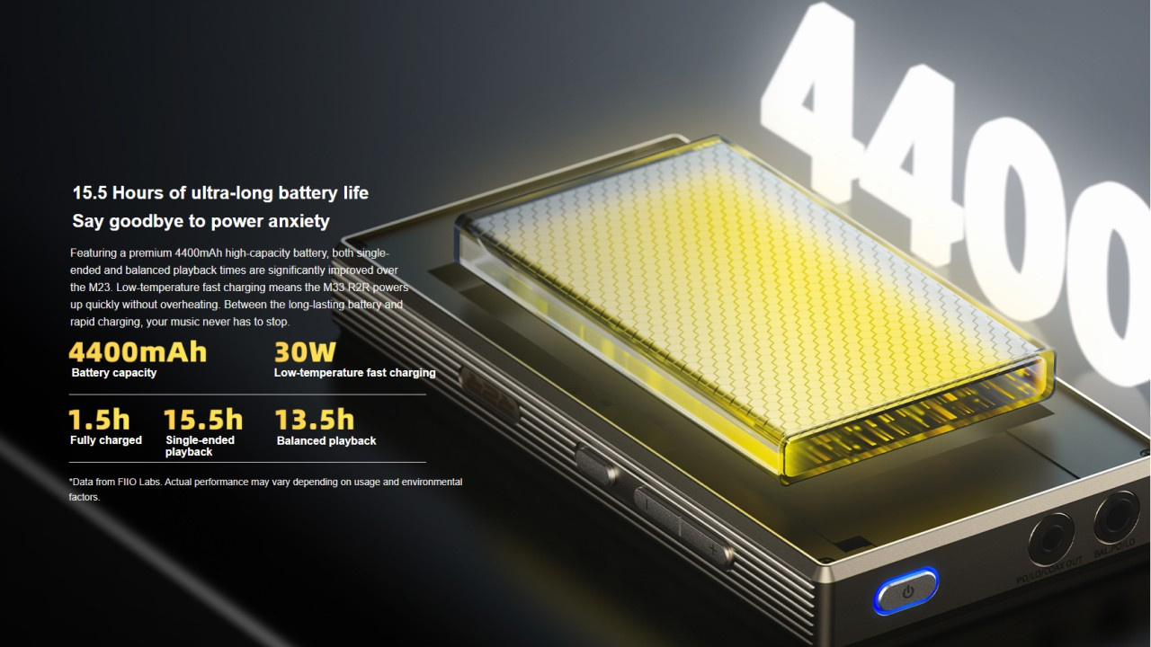 Ao utilizar a saída balanceada 4,4mm, o M33 é capaz de entregar, segundo os testes da FiiO, uma autonomia máxima de 13h e 30 min sob as mesmas condições acima, com exceção do volume, que foi ajustado para o passo 31.