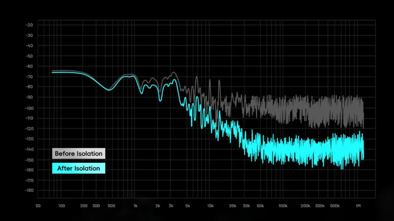 O isolamento de sinal digital é feito através de um chipset chamado “Analog Devices ADUM4165BRIZ”. Ele colabora na eliminação de loops de aterramento para remover o ruído “hum”, além de proporcionar uma redução das interferências de alta frequência.