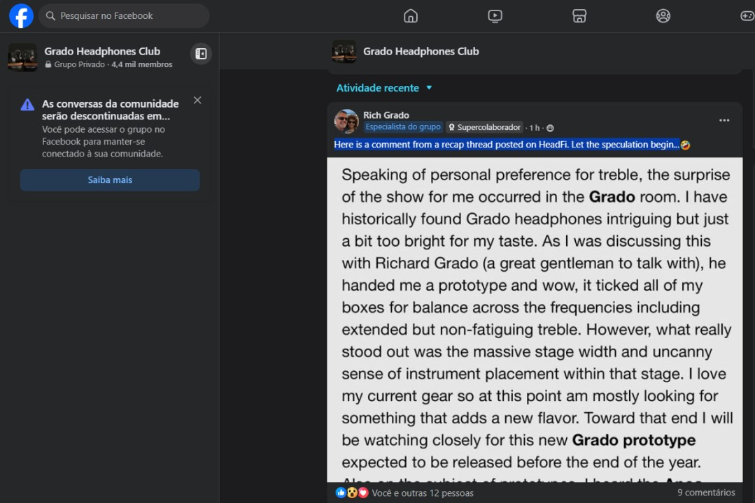O COO (Chief Operating Officer) da Grado Labs, Richard Grado, compartilhou na tarde de hoje (16) uma captura de tela contendo um texto que mostra um relato sobre um novo fone, que foi feito por um visitante do evento CanJam SoCal (Southern California) 2025. A imagem foi compartilhada no grupo “Grado Headphone Club” no Facebook, onde “Rich Grado” diz que retirou o trecho de uma publicação no fórum Head-Fi.