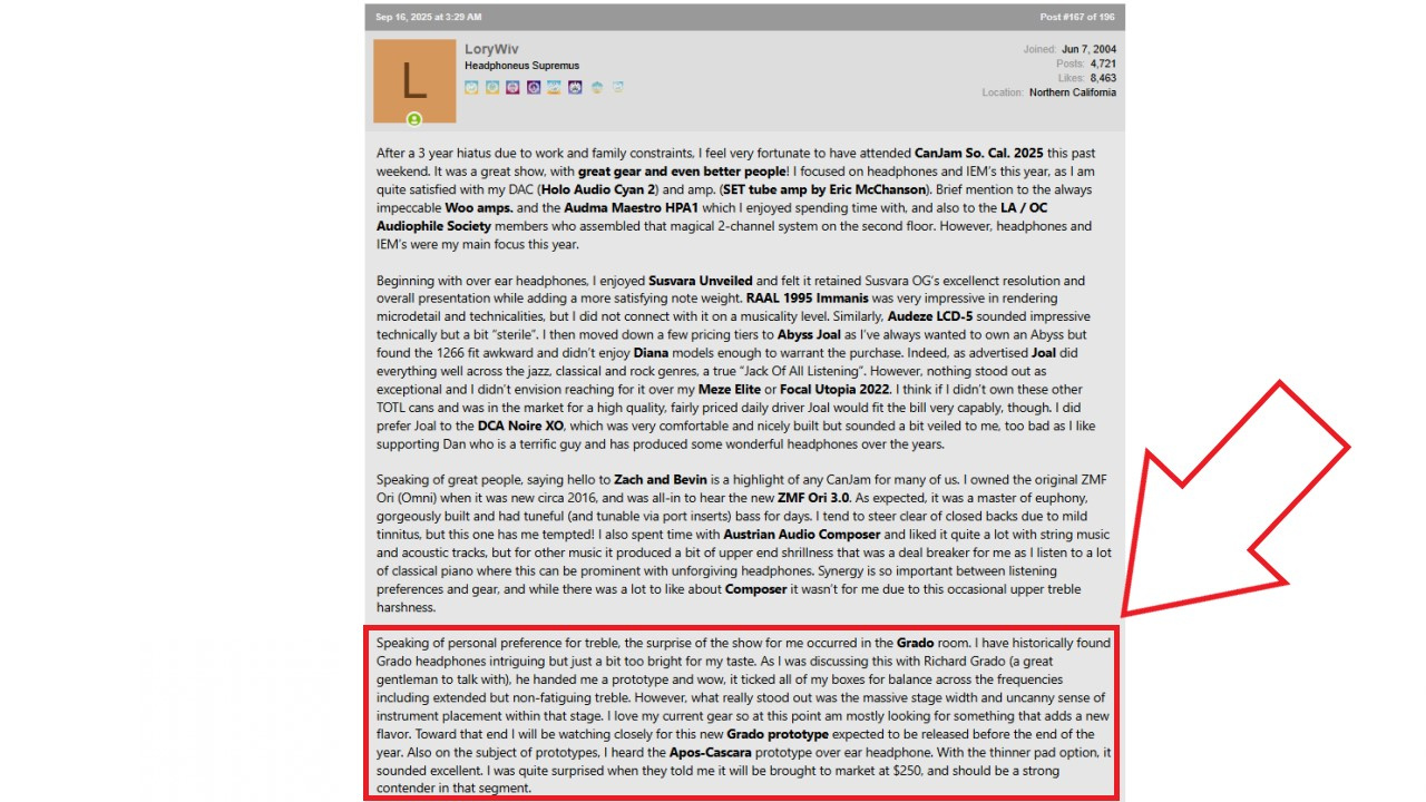Pesquisei no fórum Head-Fi pelo trecho do texto exibido na imagem compartilhada por Rich e consegui localizar o comentário original. No post #167 do tópico oficial do CanJam SoCal 2025, o usuário LoryWiv diz: